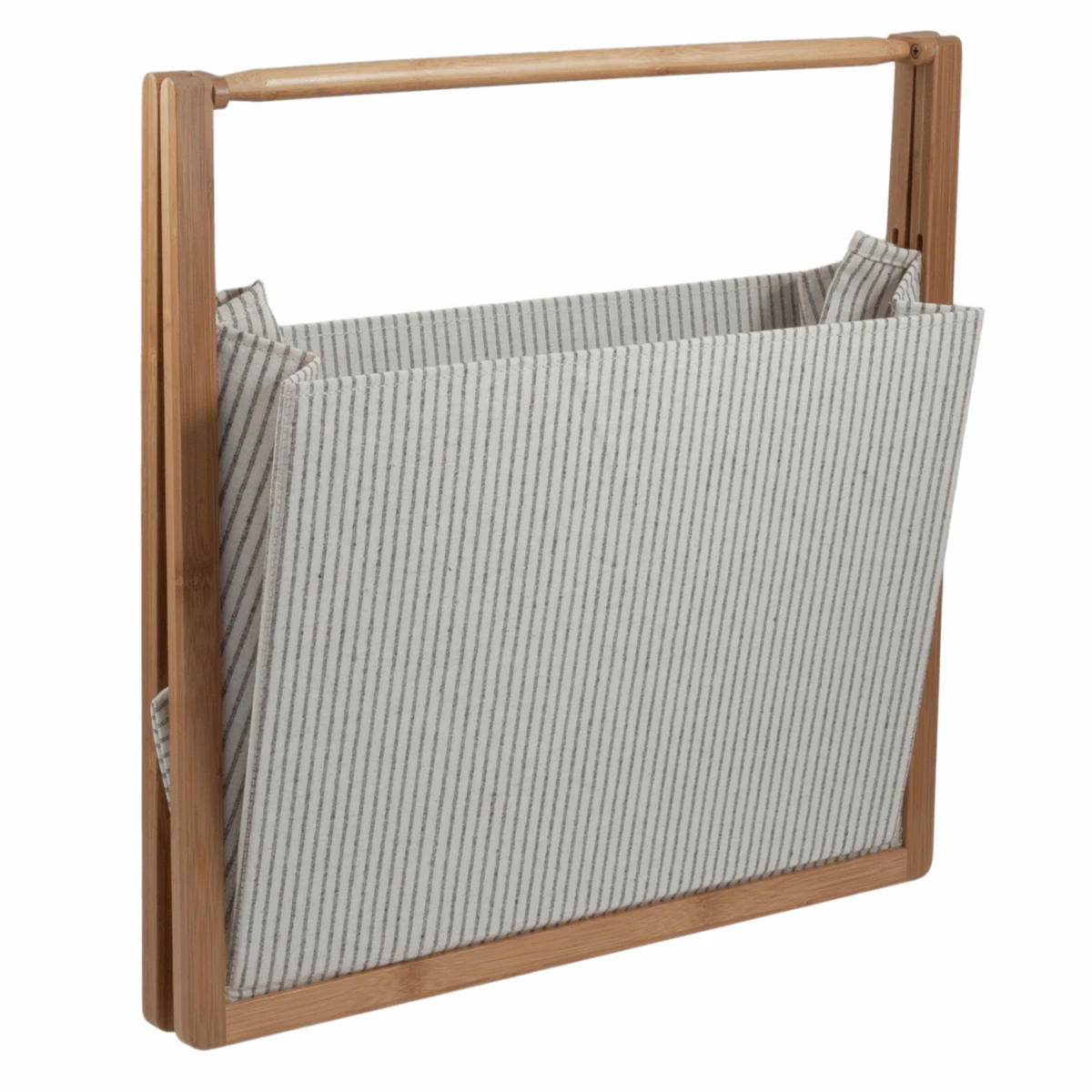 Folds flat when not in use, bamboo frame with integrated handle, contemporary style. Can be used for storing many types of crafting projects or magazines.