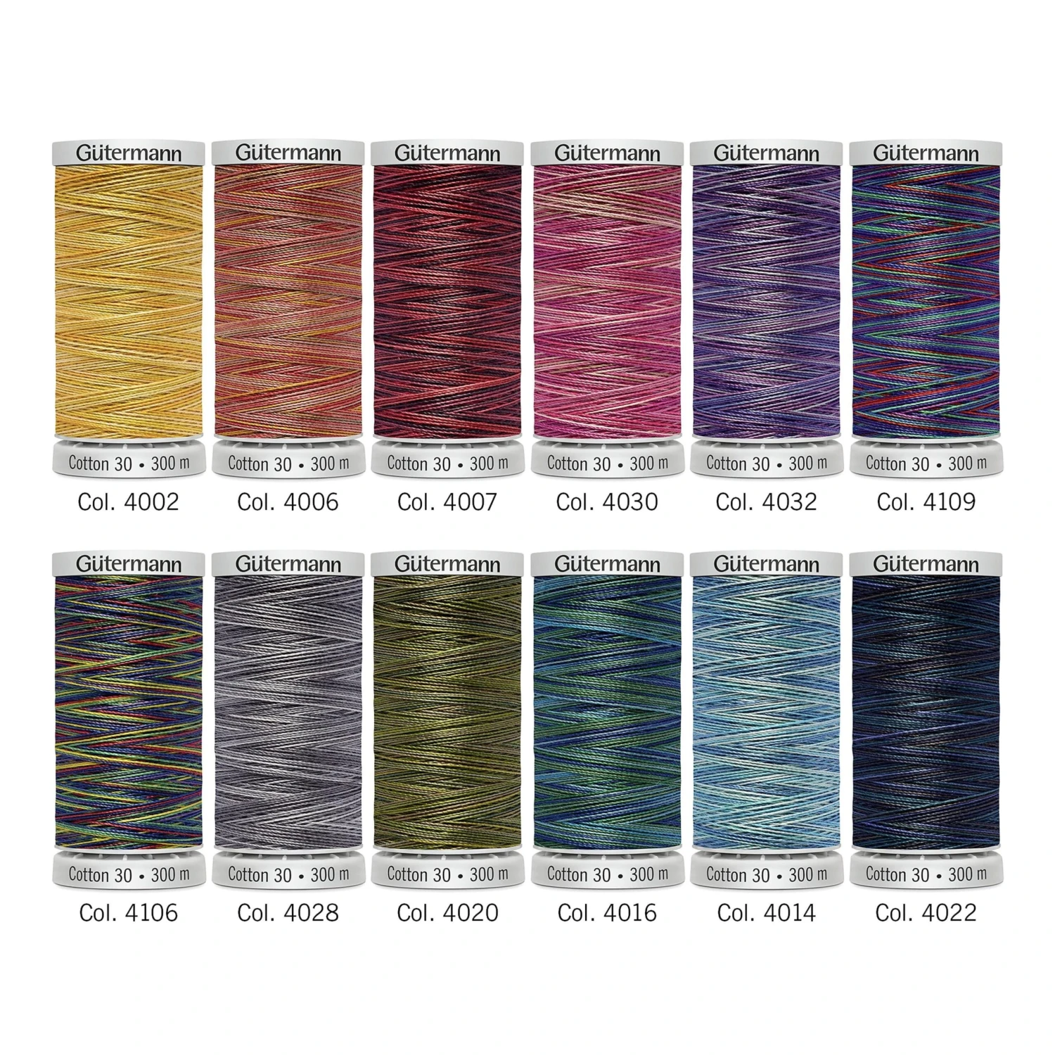 12 x 300m spools of 100% cotton in 12 best selling variegated shades.