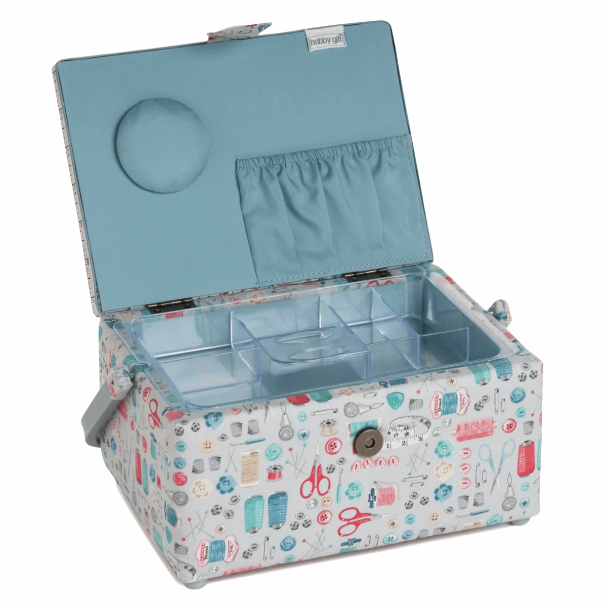 Medium-sized sewing box made from 100% cotton fabric. Lid with press stud fastening. PVC handle. Hard plastic internal tray with compartments for sewing notions. Internal pocket and pincushion inside lid. Spot clean only. d/w/h: 18 x 25 x 13cm.