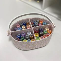 Large basket style wicker sewing box with a polycotton lining. Latch-style fastening. Raffia covered handles and edging. Hard plastic internal tray with compartments for sewing notions. Internal pocket and pincushion inside lid. Spot clean only.